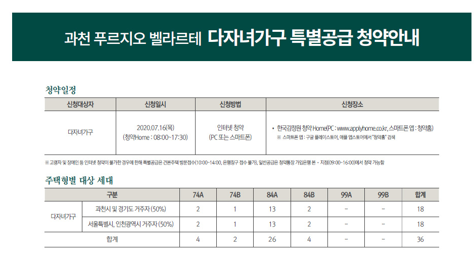 경기도 과천시 과천지식정보타운 S6블록에 위치한 ‘과천 푸르지오 벨라르테’는 지하 3층~ 지상 29층 아파트 5개동 총 504가구로 구성된다. 전용면적별로 △74㎡A 36가구 △74㎡B 19가구 △84㎡A 264가구 △84㎡B 50가구 △99㎡A 108가구 △99㎡B 27가구로 구성됐다.