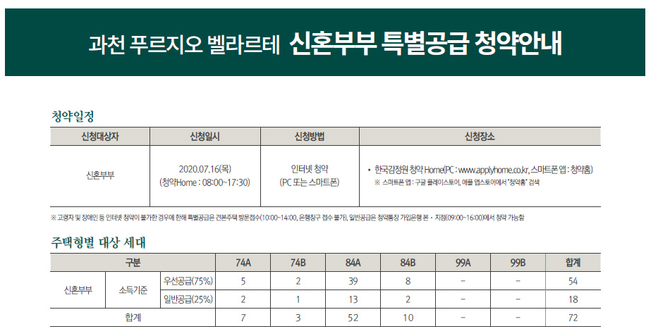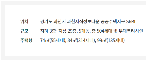 경기도 과천시 과천지식정보타운 S6블록에 위치한 ‘과천 푸르지오 벨라르테’는 지하 3층~ 지상 29층 아파트 5개동 총 504가구로 구성된다. 전용면적별로 △74㎡A 36가구 △74㎡B 19가구 △84㎡A 264가구 △84㎡B 50가구 △99㎡A 108가구 △99㎡B 27가구로 구성됐다.