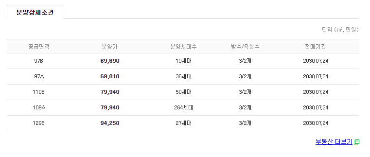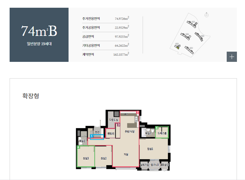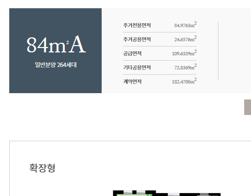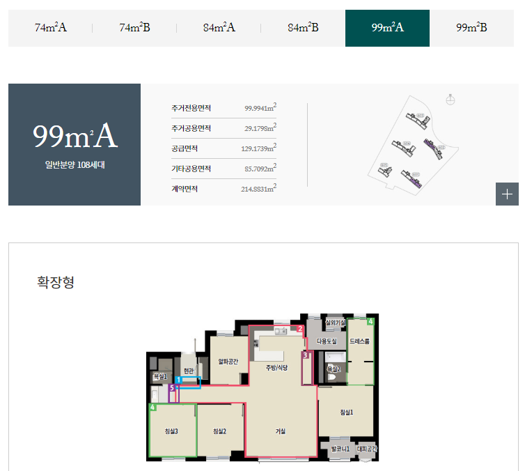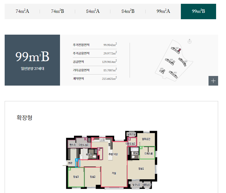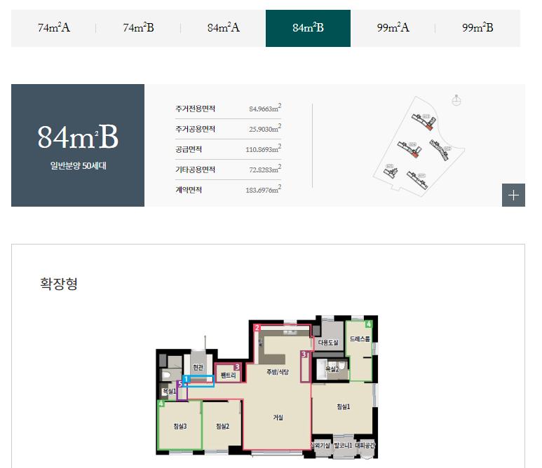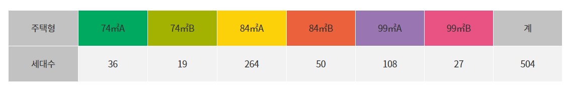 전용면적별로는 74㎡A 36가구, 74㎡B 19가구, 84㎡A 264가구, 84㎡B 50가구, 99㎡A 108가구, 99㎡B 27가구 등으로 구성된다.