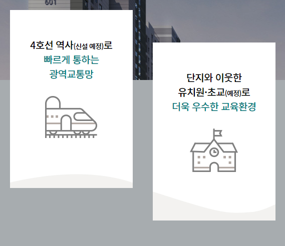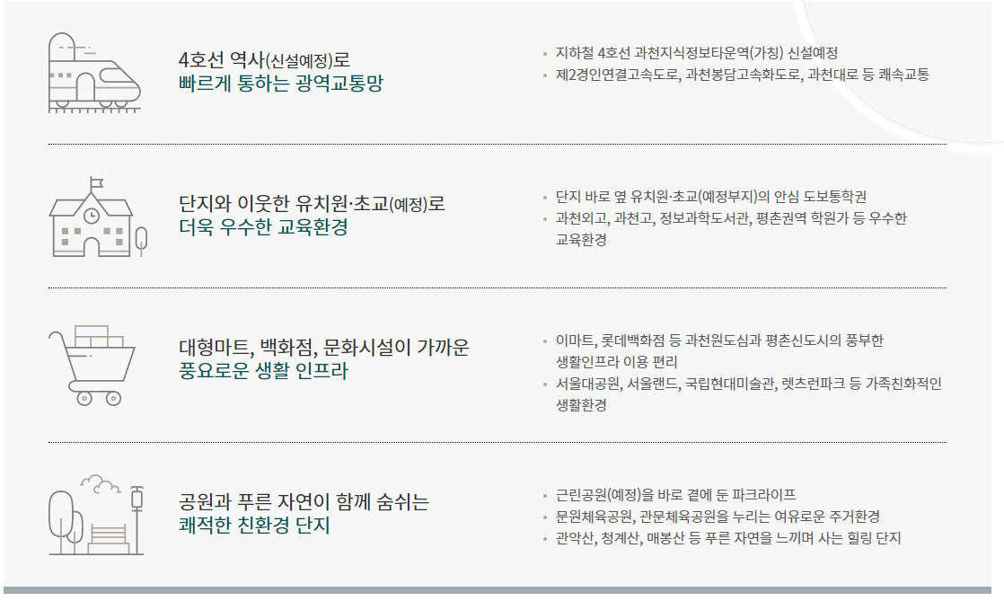 과천외고, 과천고, 정보과학도서관 등 우수한 교육환경과 서울대공원, 국립현대미술관, 렛츠런파크 등 편리한 생활여건을 갖추고 있다.