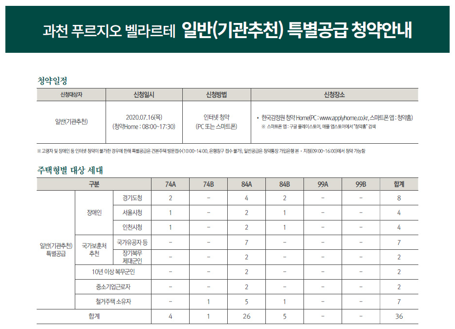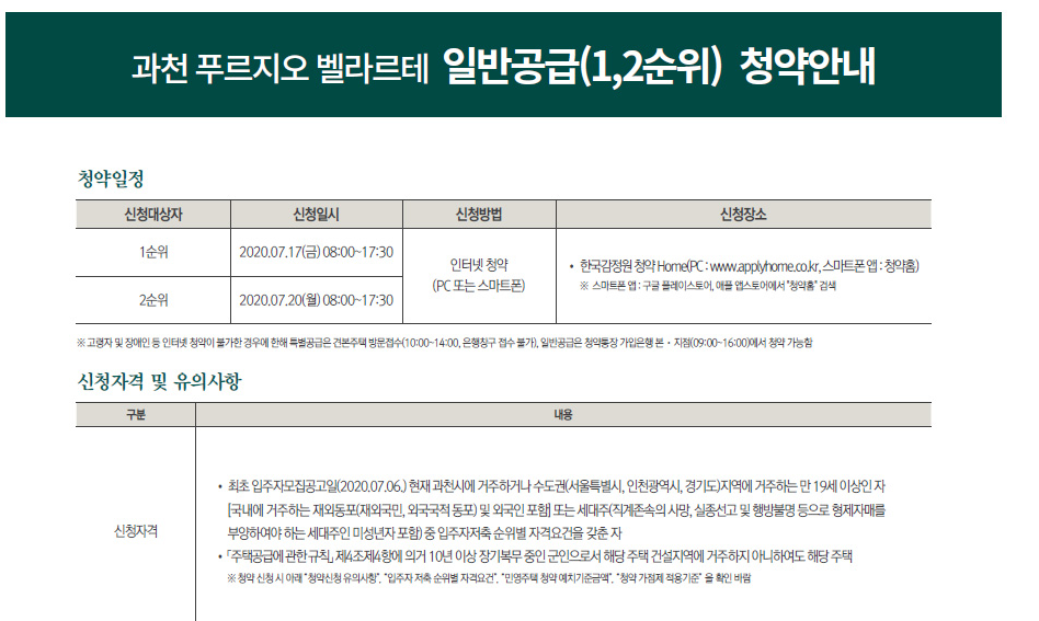 공급물량 30%는 과천시 2년이상 거주자 1순위 당해, 20%는 경기도 2년이상 거주자 1순위 기타, 나머지 50%는 서울, 인천, 경기도(2년미만) 거주자 1순위 기타 순으로 모집한다.