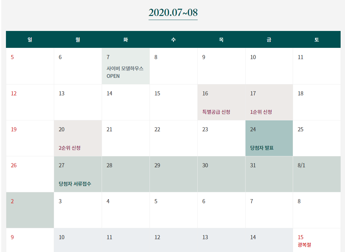 16일 특별공급신청을 시작으로 17일 1순위, 20일 2순위를 접수 받는다. 당첨자 발표는 24일이며, 계약일은 8월 10일부터 8월 14일까지다. 보다 자세한 정보는 아래에서 확인하세요.
