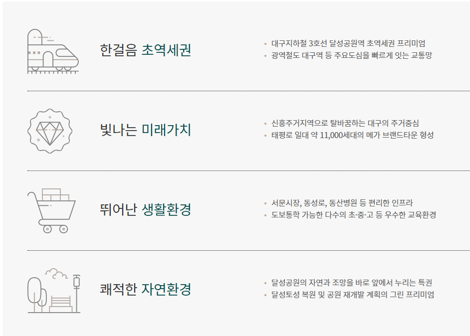 ‘달성 파크 푸르지오 힐스테이트’가 들어서는 태평로 일대는 대구역, 대구시청, 동성로가 인접한 대구의 대표 원도심이다. 때문에 대구역, 대구 1‧2‧3호선 교통 인프라와 롯데백화점‧현대백화점‧서문시장‧동산병원 등 생활인프라도 풍부하다. 달성공원‧대구복합스포츠타운‧국채보상운동 기념공원‧수창공원 등 크고 작은 공원들이 곳곳에 자리해 도심 속 녹지도 제공한다.
