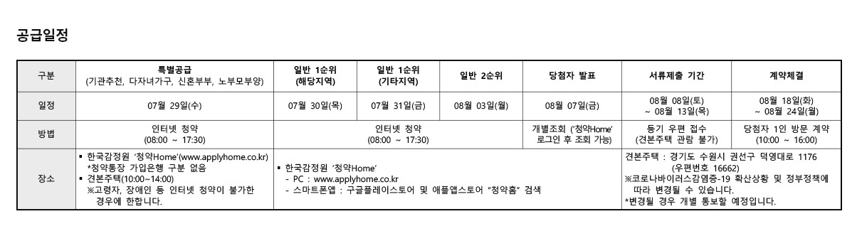 1순위 청약 자격 요건을 갖춘 청약대상자들 중 입주자모집공고일(2020.07.17) 현재 수원시 1년 이상 거주자의 경우 1순위 해당지역으로 청약하시면 되고, 수원시 1년 미만 거주자와 경기도, 인천광역시 거주자의 경우 1순위 기타지역으로 청약하시면 됩니다. 1순위 해당지역의 청약일은 7월 30일, 1순위 기타지역의 청약일은 7월 31일로 각각 다른 날짜에 청약 신청합니다.