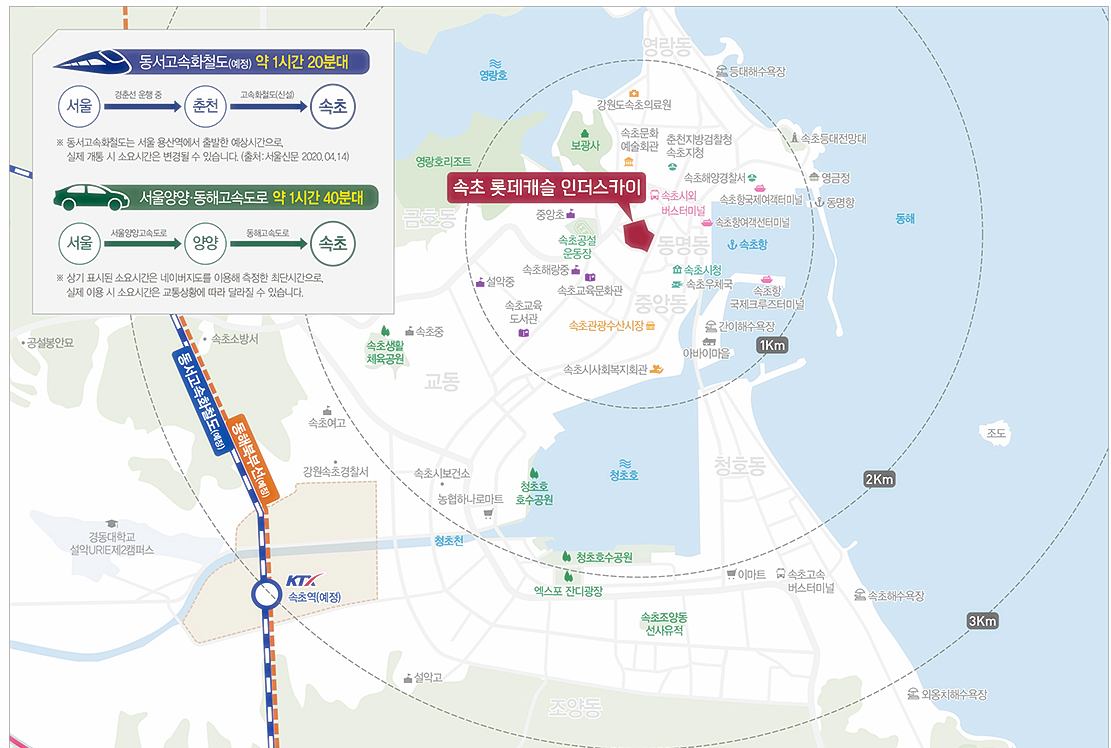 특히 춘천~속초를 잇는 동서고속화철도 속초역(예정)이 완공되면, 용산역까지 1시간 10분대로 이동도 가능할 것으로 예상돼 서울 및 수도권 생활도 가능할 것으로 기대된다.