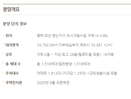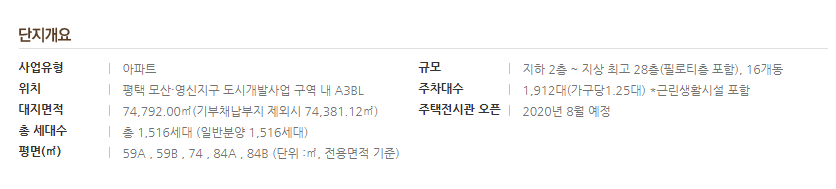 사업유형 아파트 규모 지하 2층 ~ 지상 최고 28층(필로티층 포함), 16개동 위치 평택 모산·영신지구 도시개발사업 구역 내 A3BL 주차대수 1,912대(가구당1.25대) *근린생활시설 포함 대지면적 74,792.00��