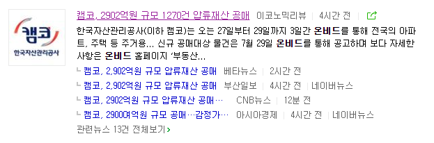 최근에 난 기사인데요. 한국자산관리공사(이하 캠코)는 7월 27일부터 29일까지 3일간 온비드를 통해 전국의 아파트, 주택 등 주거용 건물 210건을 포함한 2902억원 규모, 1270건의 물건을 공매한다는 기사였는데요. 보다 자세한 내용은 아래에서 확인해 보세요.