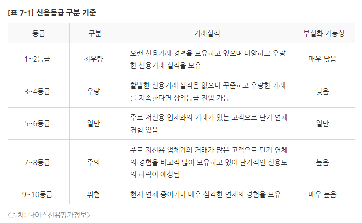 9~10 등급은 위험 등급으로 현재 연체중이거나 부실화 위험이 매우 높은 신용등급이다.