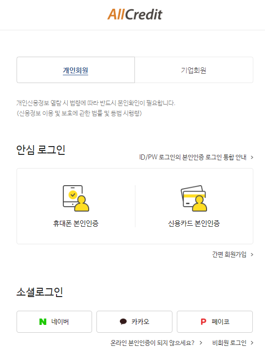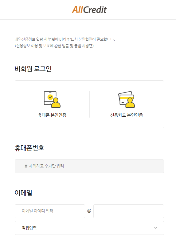 올크레딧 홈페이지에서는 다양한 신용관리와 카드관리, 대출관리 등의 서비스를 제공하고 있는데 신용등급 무료조회 서비스도 비회원으로 이용하실 수 있어 많은 분들이 사용한다.