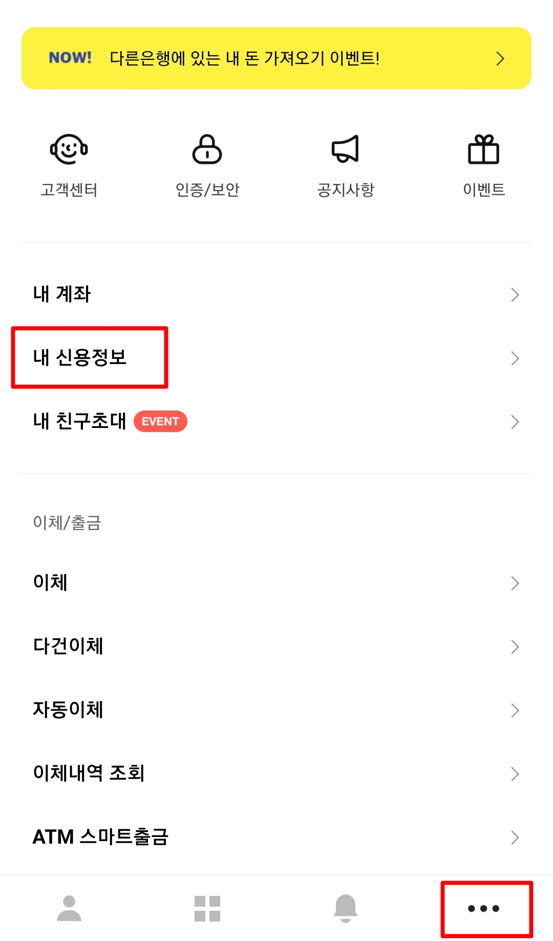 카카오뱅크에서 우측 하단의 ‘전체’ 메뉴를 클릭하신 후 내 신용정보 항목으로 이동해 주시면 되겠습니다.