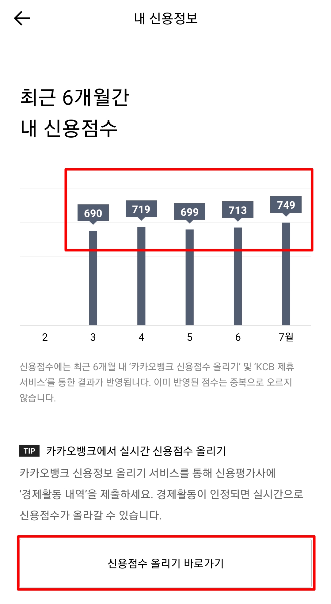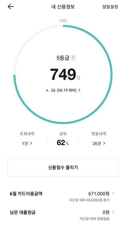 749점이면 5등급으로 6.19일 대비 36점이 상승한 것으로 확인이 됩니다.