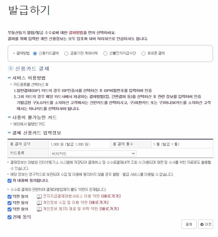 이제 발급을 위한 수수료 1,000원 결제하면
