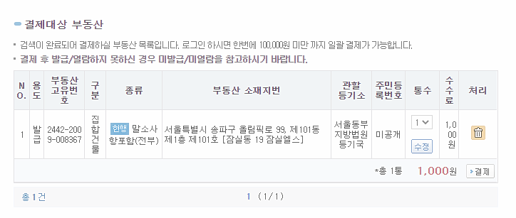 잠실에스 단지 1동 101호를 발급, 열람해 볼께요.