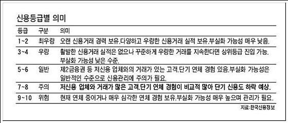 신용등급이 1등급에 가까울수록 신용 상태가 좋다는 의미이며 10등급에 가까우면 신용도가 낮다고 판단되어 대출한도나 금리 면에서 불이익을 받게 됩니다. 특히 7~10등급은 대출이나 신용카드 발급이 거절되기도 하는 등 금융거래를 할 때 많은 불편함을 겪을 수 있습니다. 신용상태에 대해서 아래에서 알아보세요.