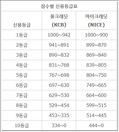 오는 2021년부터 금융기관의 개인신용평가 체계가 '등급제'에서 '점수제'로 전면 전환되어, 현행 10등급 체계의 신용등급이 최대 1000점의 신용점수로 표시·관리됩니다.
