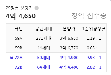 29평 분양가, 그리고 1순위 청약경쟁률 보시면 59B는 미달이고 72B 또한 줍줍이 나올 수도 있는 상황입니다.