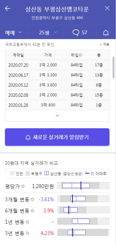브라운스톤 부평과 마주보게되는 부평삼산에코타운 살펴볼께요. 여기는 시세가 아래와 같습니다.