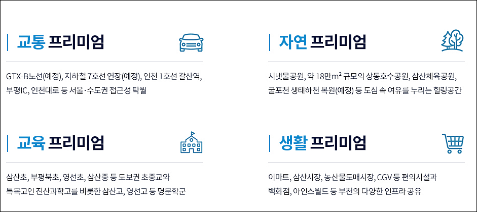 삼산초, 부평북초, 영선초, 삼산중 등 도보권에 초중교가 위치해 있으며 특목고인 진산과학고를 비롯한 삼산고, 영선고 등 명문학군도 인근에 있다. 요즘 핫한 다른 분양단지 검색은 아래에서 확인해보세요.