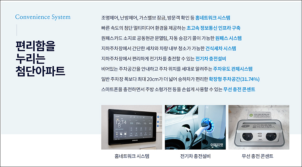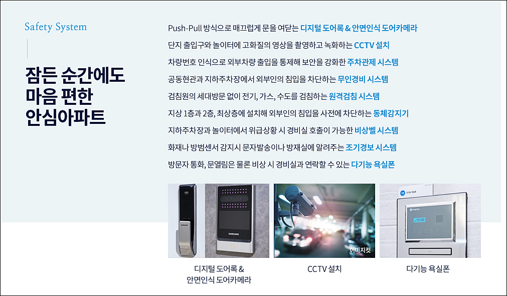 안심 아파트답게 보안에도 신경 썼다. 디지털 도어록 & 안면인식 도어카메라, CCTV, 주차관제 시스템, 무인경비 시스템, 원격검침 시스템, 동체감지기, 비상벨 시스템, 조기경보시스템 등이 적용된다.