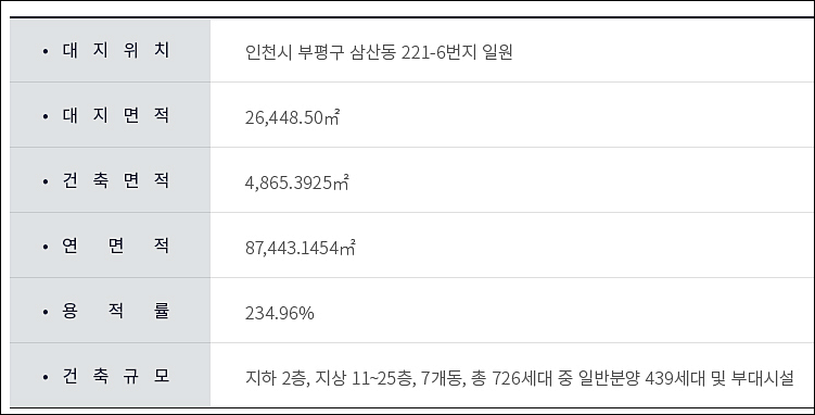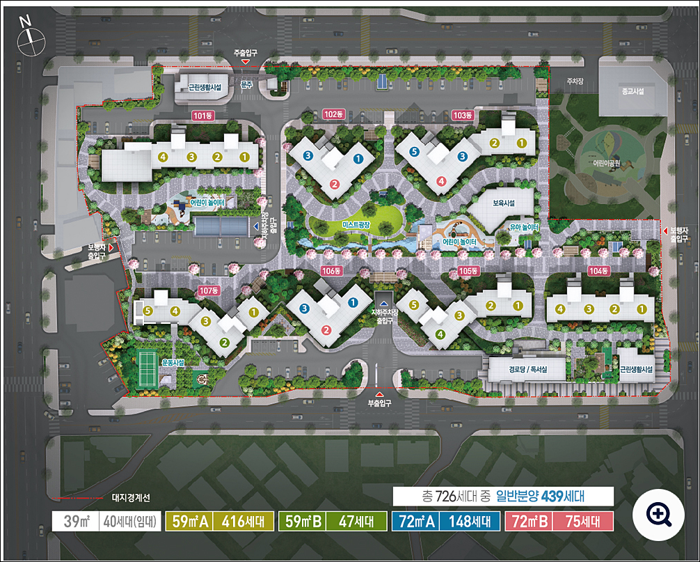 단지는 지하 2층~지상 25층 7개 동 전용면적 59㎡, 72㎡ 총 726가구 중 439가구가 일반분양분이다. 타입 별 가구 수는 △59㎡A 281가구 △59㎡B 44가구 △72㎡A 50가구 △72㎡B 64가구다.