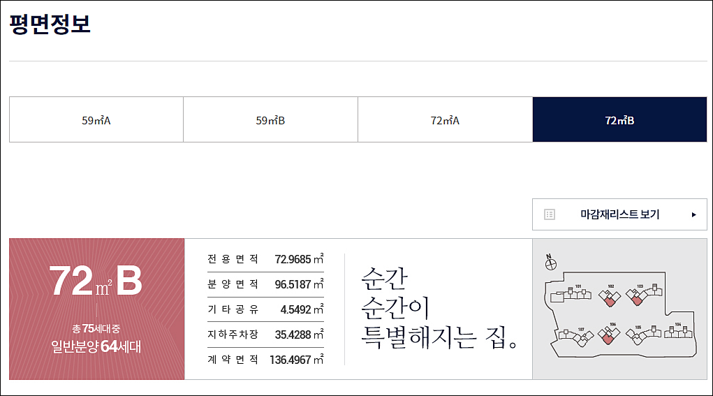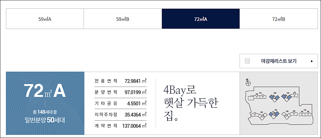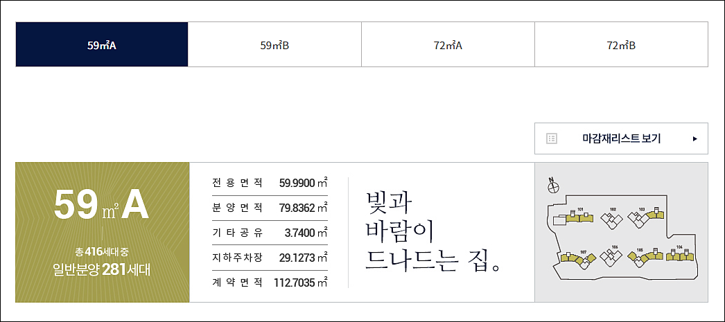 아래에서 확인 가능합니다. 79타입과 97A, 96B 3.6억 ~ 4.4억 구성입니다.