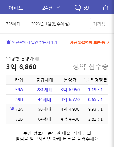 29평 분양가, 그리고 1순위 청약경쟁률 보시면 59B는 미달이고 72B 또한 줍줍이 나올 수도 있는 상황입니다.