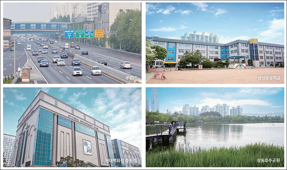 단지 주변으로 생활인프라가 잘 갖춰져 있어 이마트, 삼산시장, 농산물도매시장, CGV 등 편의시설이 풍부하고 백화점, 아인스월드 등 부천의 다양한 인프라도 공유할 수 있다.