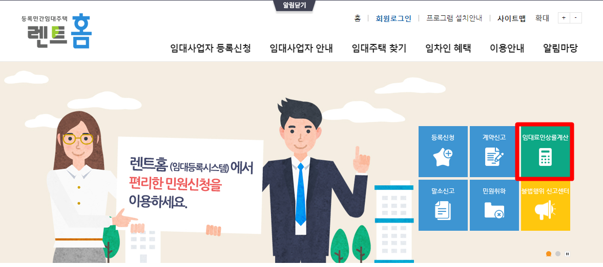 렌트홈에 들어가시면 오른쪽 상단의 임대료인상률계산 클릭하세요.