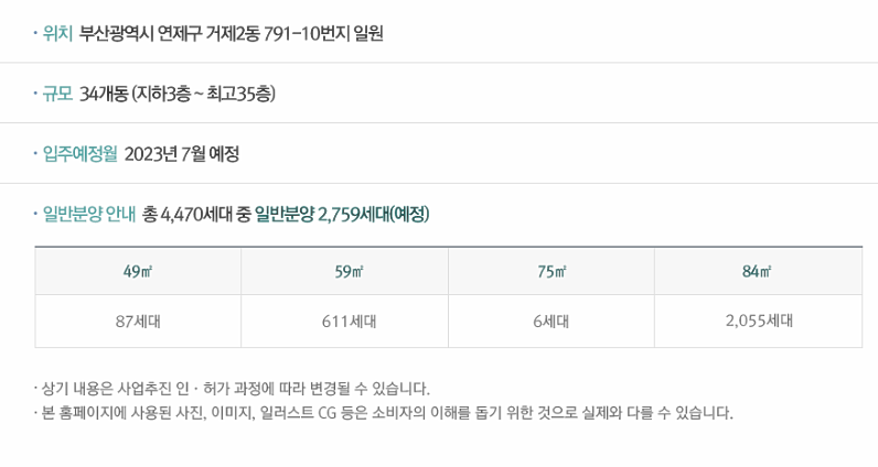 전용면적별 일반분양 물량은 49㎡A 80가구, 49㎡B 7가구, 59㎡A 423가구, 59㎡B 188가구, 75㎡A 4가구, 75㎡B 2가구, 84㎡A 982가구, 84㎡B 1073가구다.