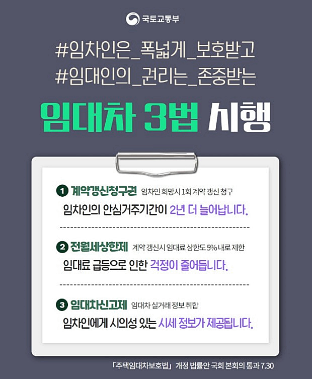 | 임대차 3법이란? 전월세신고제·전월세상한제·계약갱신청구권제 등을 핵심으로 하는 법안으로, 계약갱신청구권과 전월세상한제를 핵심으로 한 ‘주택임대차보호법’ 개정안과 전월세신고제를 핵심으로 한 '부동산 거래신고 등에 관한 법률' 개정안이 이에 포함된다. 이 가운데 계약갱신청구권제와 전월세상한제를 담은 주택임대차보호법 개정안은 2020년 7월 30일 국회를 통과한 데 이어 7월 31일 국무회의를 통과하면서 이날부터 시행됐다. |