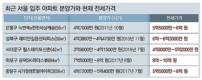 예를들어, 이달 입주하는 서울 서대문구 북아현동 힐스테이트신촌 전용면적 42m²는 전세 물건이 4억8000만∼5억2000만 원에 나와 있다. 2018년 7월 분양 당시 공급가격은 3억9000만∼4억1500만 원으로 전세가격이 분양가를 1억 원 정도 넘어섰다.