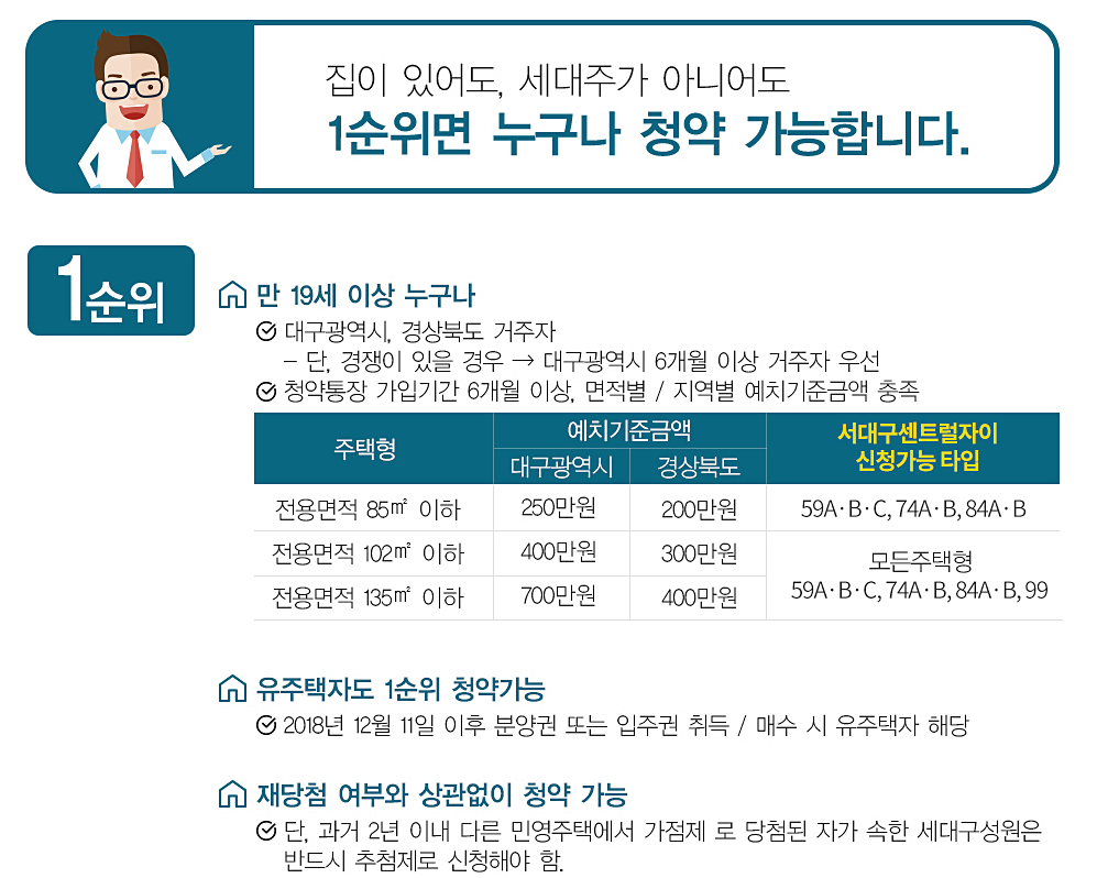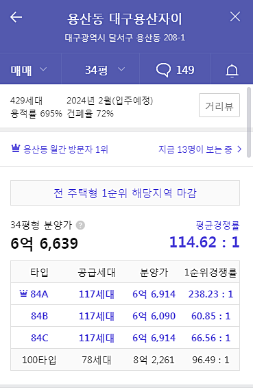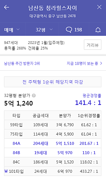 경쟁률이 높을것으로 예상되며 사실상 대구 주소지로 1순위 청약가점이 높은 분 순으로 당첨자가 결정되겠네요. 예치금 최소 400만원 이상이되면 모든 타입에 청약을 넣을 수 있습니다. 요즘 핫한 다른 분양단지 청약을 검토하고 있다면 아래에서 확인해보세요.