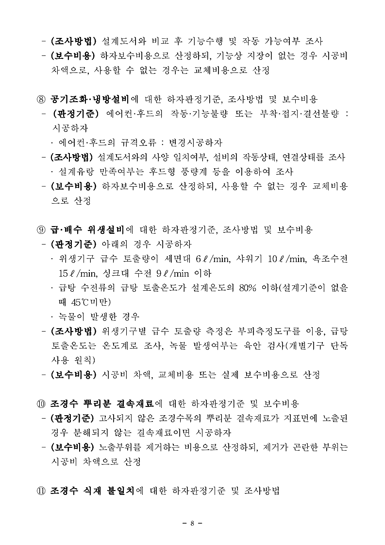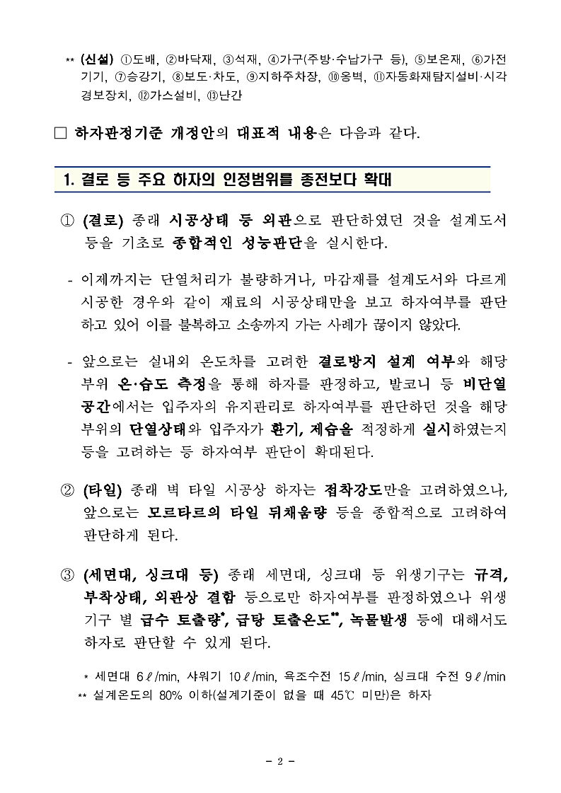 결로 등 기존에 하자 판정 기준이 있었던 12개 항목에 대해서는 인정 범위를 기존보다 확대하고 조사방법을 구체화했습니다.