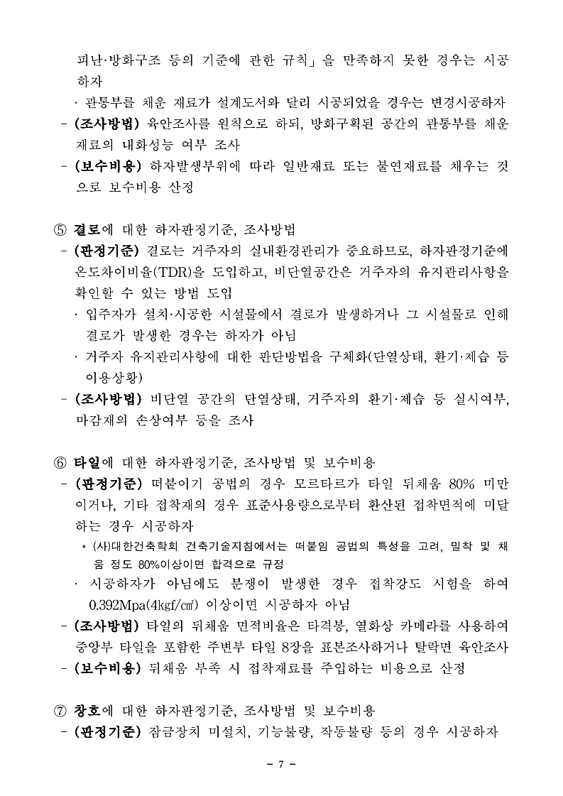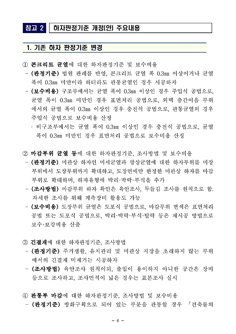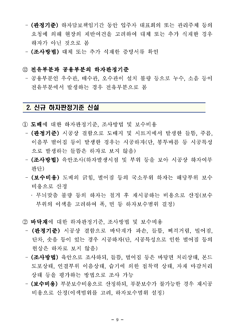 아래는 「공동주택 하자의 조사, 보수비용 산정 및 하자판정기준」개정 자료입니다.