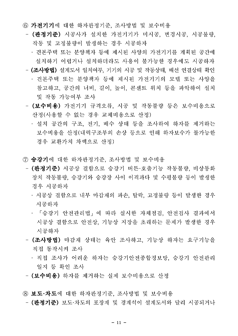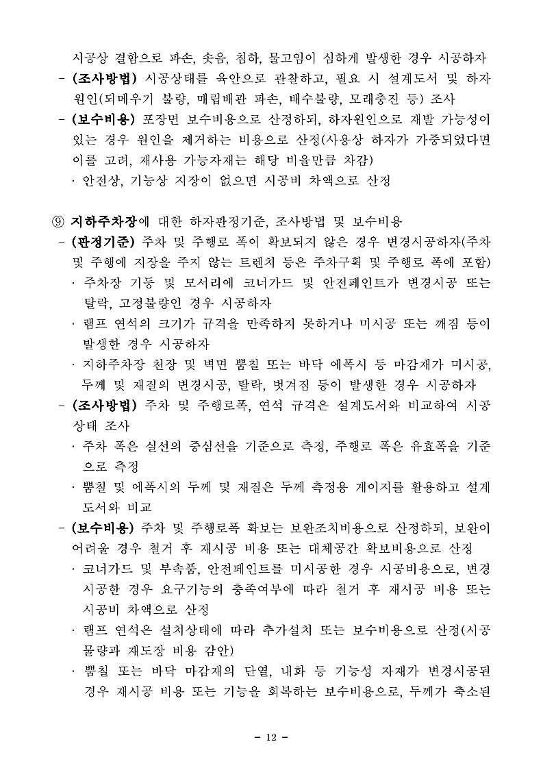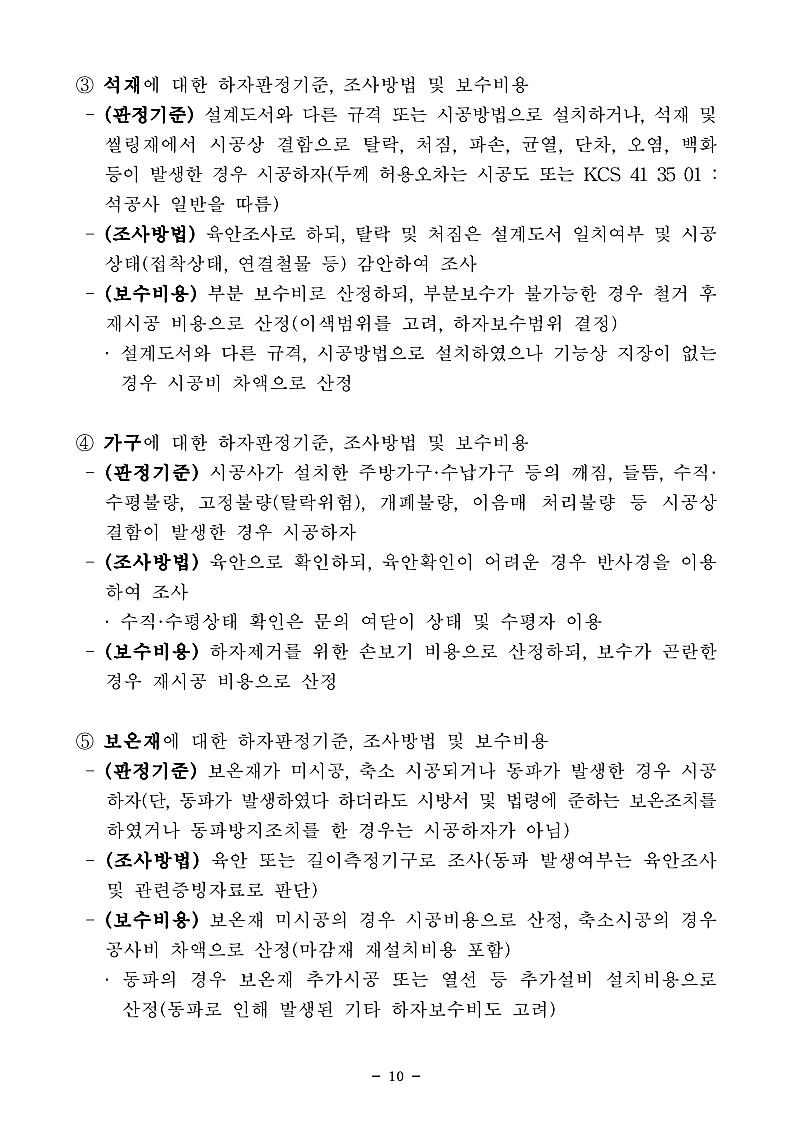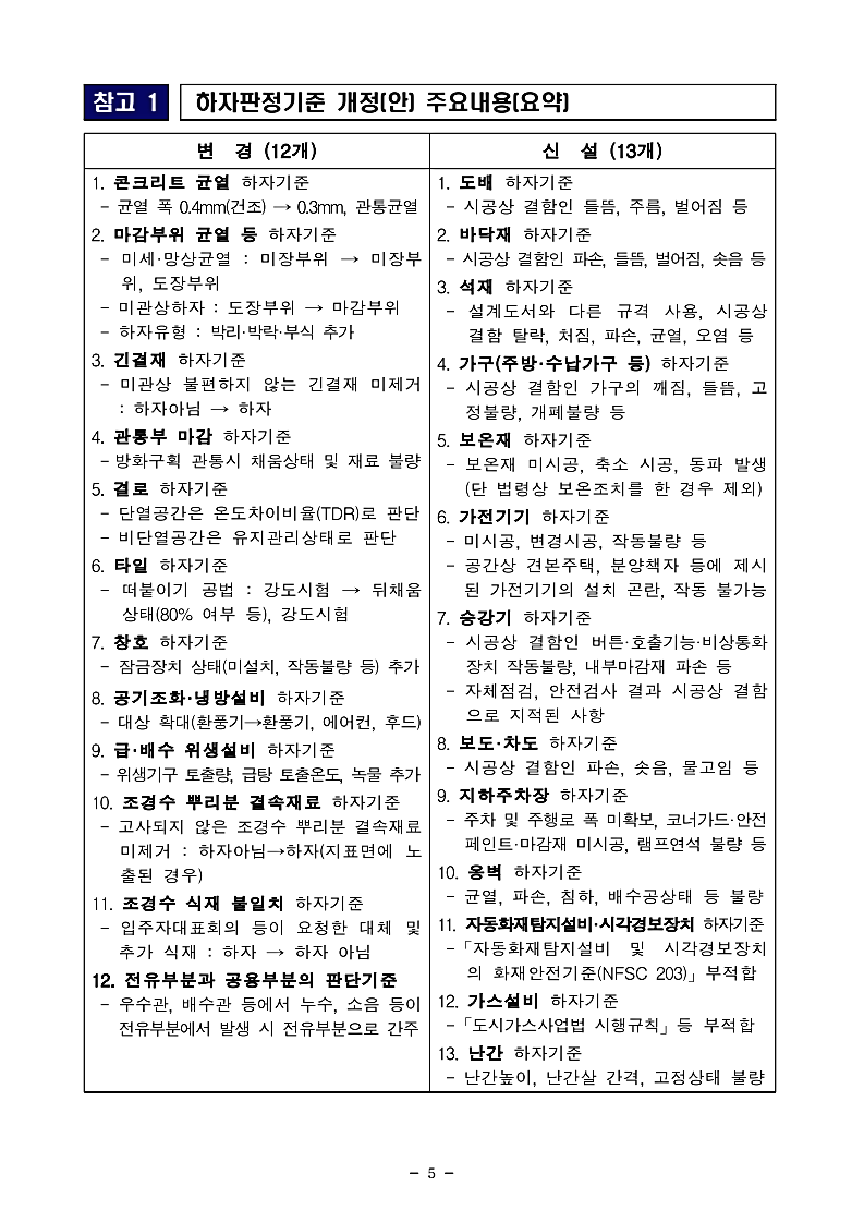 아래는 「공동주택 하자의 조사, 보수비용 산정 및 하자판정기준」개정 자료입니다.