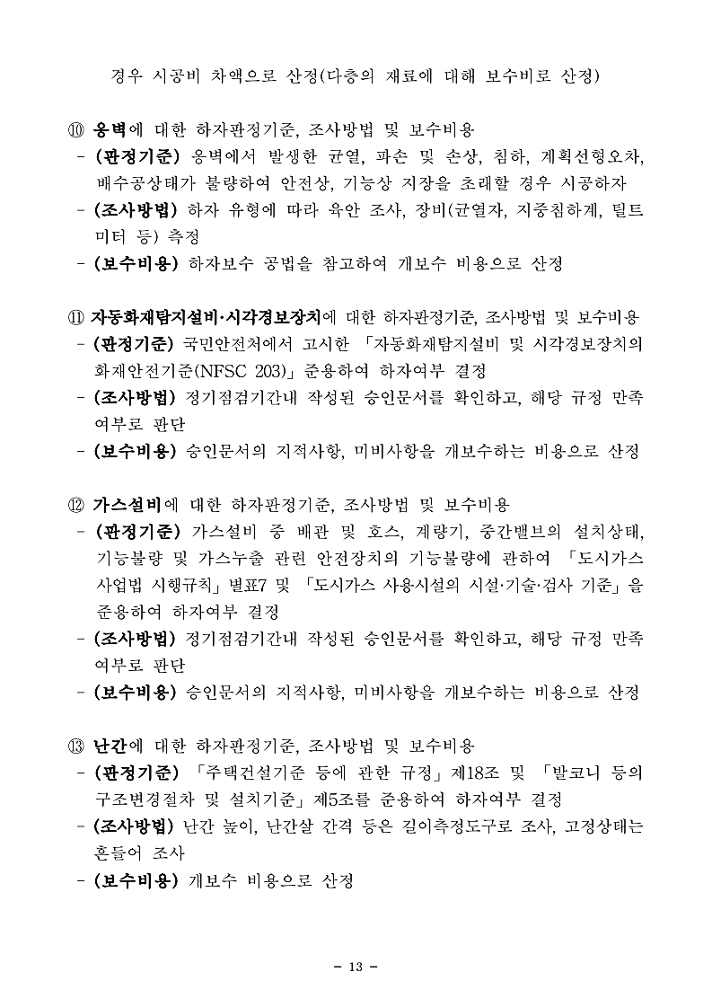 이번에 기준이 새로 마련된 항목은 도배, 바닥재, 석재, 가구, 보온재, 가전기기, 승강기, 보도·차도, 지하주차장, 옹벽, 자동화재탐지설비·시각경보장치, 가스 설비, 난간입니다.