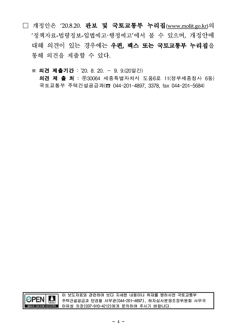 행정예고 기간 개정안에 대해 의견이 있는 경우 우편, 팩스 또는 국토교통부 누리집을 통해 의견을 제출할 수 있습니다. 개정안은 관보나 국토교통부 누리집(www.molit.go.kr)의 '정책자료-법령정보-입법예고·행정예고'에서 찾아볼 수 있습니다.
