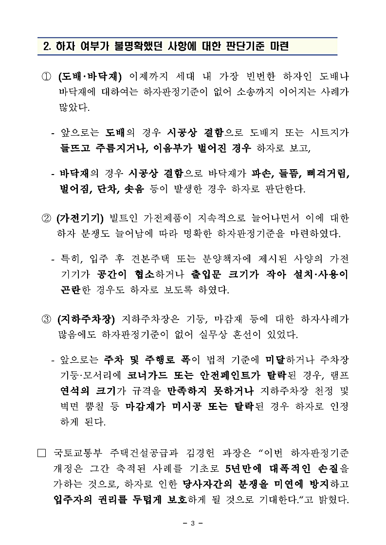 하자와 관련된 분쟁이 끊이지 않자, 국토교통부는 입주자들을 보호하기 위해 하자로 인정하는 범위와 기준을 늘리기로 했습니다. 국토부는 하자심사분쟁조정위원회가 하자 판정에 사용하는 '공동주택 하자의 조사, 보수비용 산정 및 하자판정기준' 개정안을 행정예고했습니다.