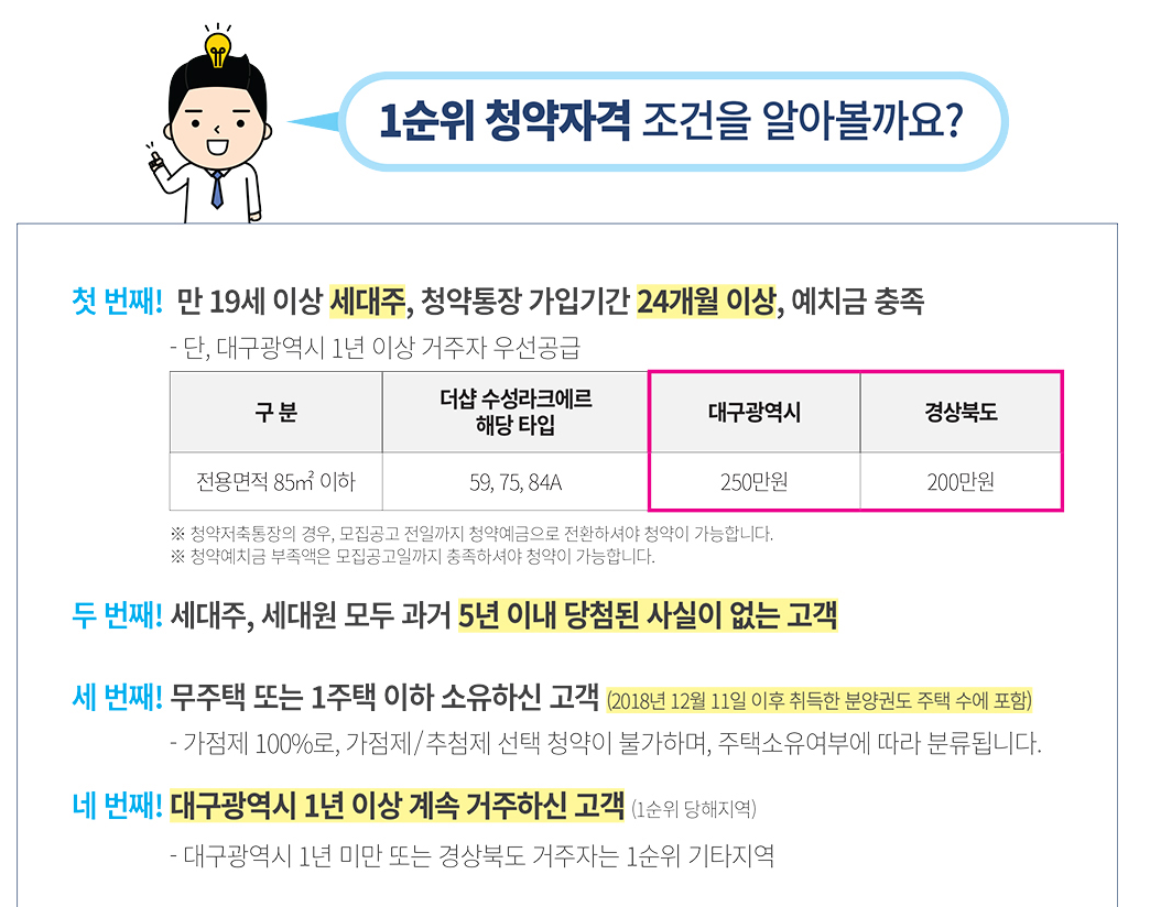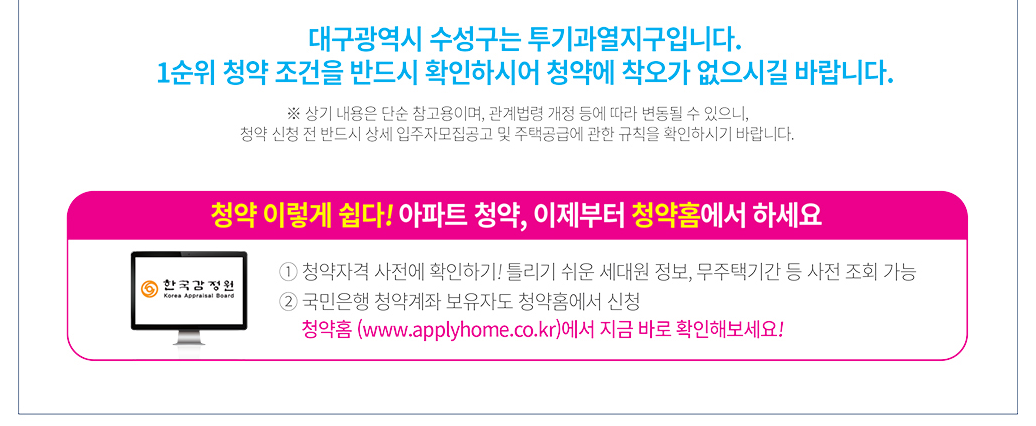 포스코건설은 대구 수성구 ‘더샵 수성라크에르’의 사이버 견본주택을 오는 21일 열고 분양합니다. 더샵 수성라크에르는 이달 31일 특별공급을 시작으로 다음달 1일 1순위, 3일 2순위 청약을 한국감정원 청약홈에서 진행한다. 당첨자 발표는 다음달 9일이고 계약은 21~23일이다. 보다 자세한 분양정보는 아래를 참고하세요.