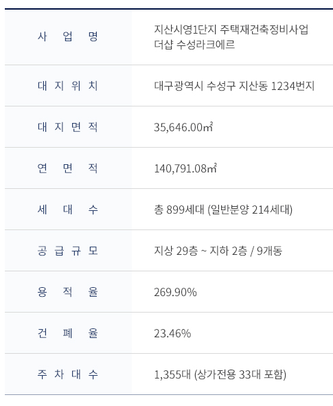 더샵 수성라크에르는 대구광역시 수성구 지산동 1234번지 일대 지산시영1단지를 재건축하는 아파트다. 지상 최고 29층 9개동, 전용면적 59~84㎡, 899가구 규모다. 이 중 214가구를 일반분양한다. 일반분양 가구수는 59㎡ 113가구, 75㎡ 99가구, 84㎡A 2가구다. 입주는 2023년 5월 예정이다.