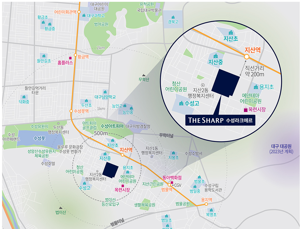 단지에서는 대구도시철도 3호선 지산역을 걸어서 갈 수 있다. 수성IC와도 가깝다. 대구지하철 3호선의 연장이 추진 중이어서 교통환경은 더욱 편리해질 것으로 전망된다. 대구의 랜드마크로 불리는 ‘수성못’과 수성유원지, 거목식물원, 수성랜드, 대구어린이대공원, 범어공원 등도 인근에 있다.