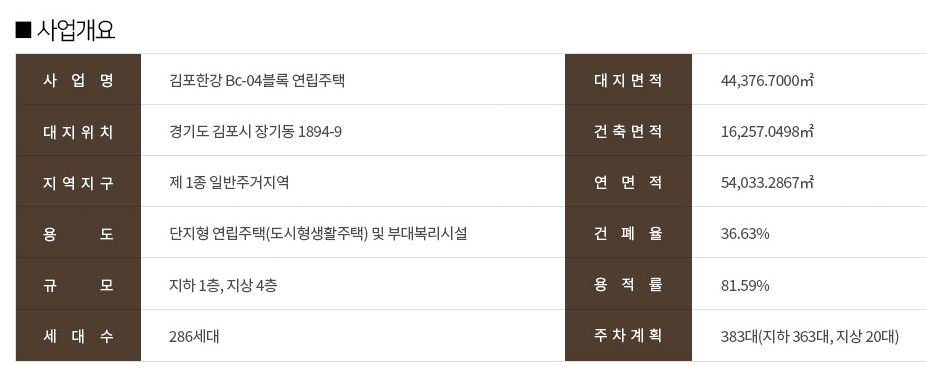 경기도 김포시 장기동 1894-9번지 일원에 들어서는 김포한강신도시 범양레우스 라세느는 범양건영이 시공하며, 총 286가구로 각 세대는 지하 1층~지상 4층, 전용면적 84㎡ 규모다.