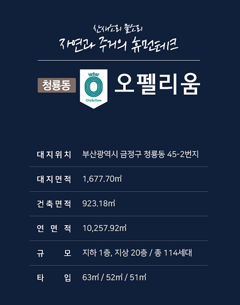 이러한 가운데 부산 금정구에 숲세권 입지를 확보하는 '청룡동 오펠리움'이 분양 중이다. 사업지는 천년고찰 범어사 인근에 위치해 뒤로 금정산이, 앞으로 온천천이 흐르는 입지를 갖춘다.
