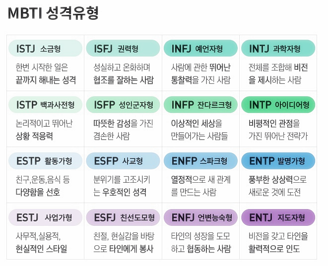 사람에 성격을 유형별로 분류해서 분석하려는 시도에 역사는 꽤 오래되었다고 합니다. 수백 수천만 가지의 다른 성격을 파악하고 분류하는 것이 불가능하다고 생각할 수도 있지만 크게 나누어 보면 몇가지 유형으로 분류할 수 있는 것이죠. 이렇게 분류한 성격 유형을 통해 사람에 대한 보다 깊은 이해와 왜 그런 행동을 하는지 예측과 함께 대처가 가능하다고 합니다. 이번 시간에는 mbti 성격유형검사에 대해 알아보도록 하겠습니다.