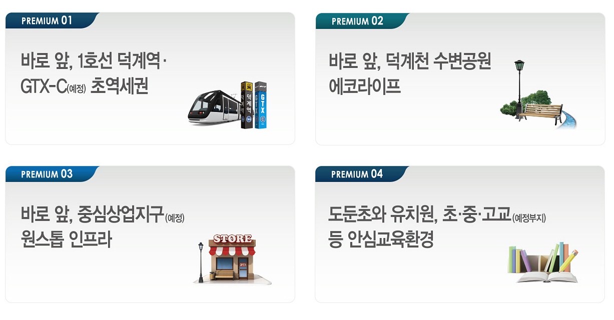 양주 회천신도시 중심지에 위치해 도보 1분 거리에 지하철 1호선 덕계역이 있고 내년 말 착공 예정인 GTX-C 노선 덕정역이 개통될 예정입니다.