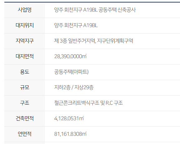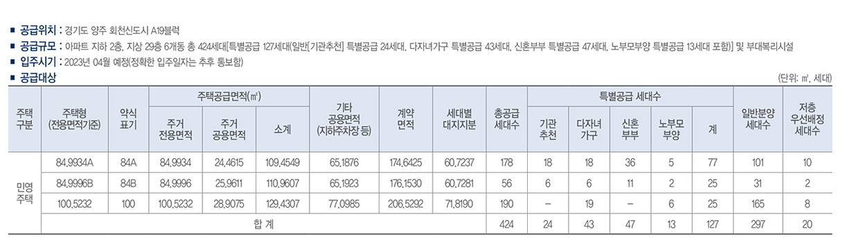 지하 2층~지상 29층 6개 동으로 구성된 이 단지는 총 2만2000여 가구로 계획된 양주 회천신도시에서 유일하게 중대형 평형으로만 구성됐습니다. 전용 △84㎡A 178가구 △84㎡B 56가구 △100㎡ 190가구 등 총 424가구로 이뤄져 있고, 2023년 4월 입주 예정입니다.