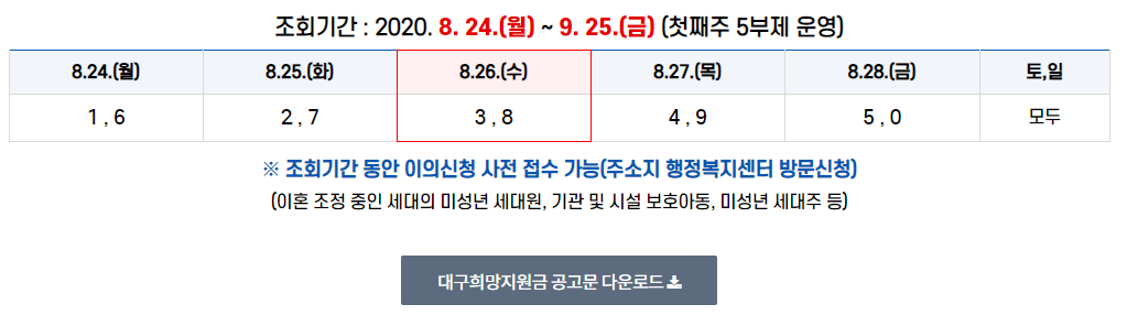 - 대구행복페이 방문신청 5부제 운영기간 : 9. 7. ~ 9. 11.
