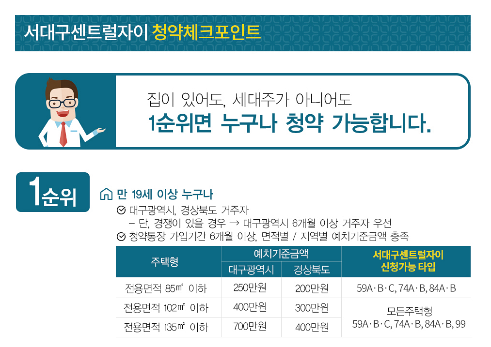 '서대구센트럴자이'는 아파트 지하 2층~지상 33층, 13개 동, 전용면적 59~125㎡, 총 1526가구(일반분양 1071가구)와 주거형 오피스텔 132실로 구성된다. 자세한 내용은 아래를 참고해주세요!!