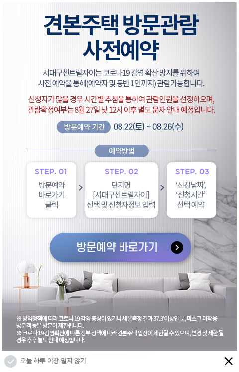 코로나19 확산 방지를 위해 견본주택 방문 관람 사전 예약제를 운영한다. 26일까지 홈페이지에서 사전 방문 관람 예약을 실시한다. 자세한 내용은 아래를 참고해주세요!!