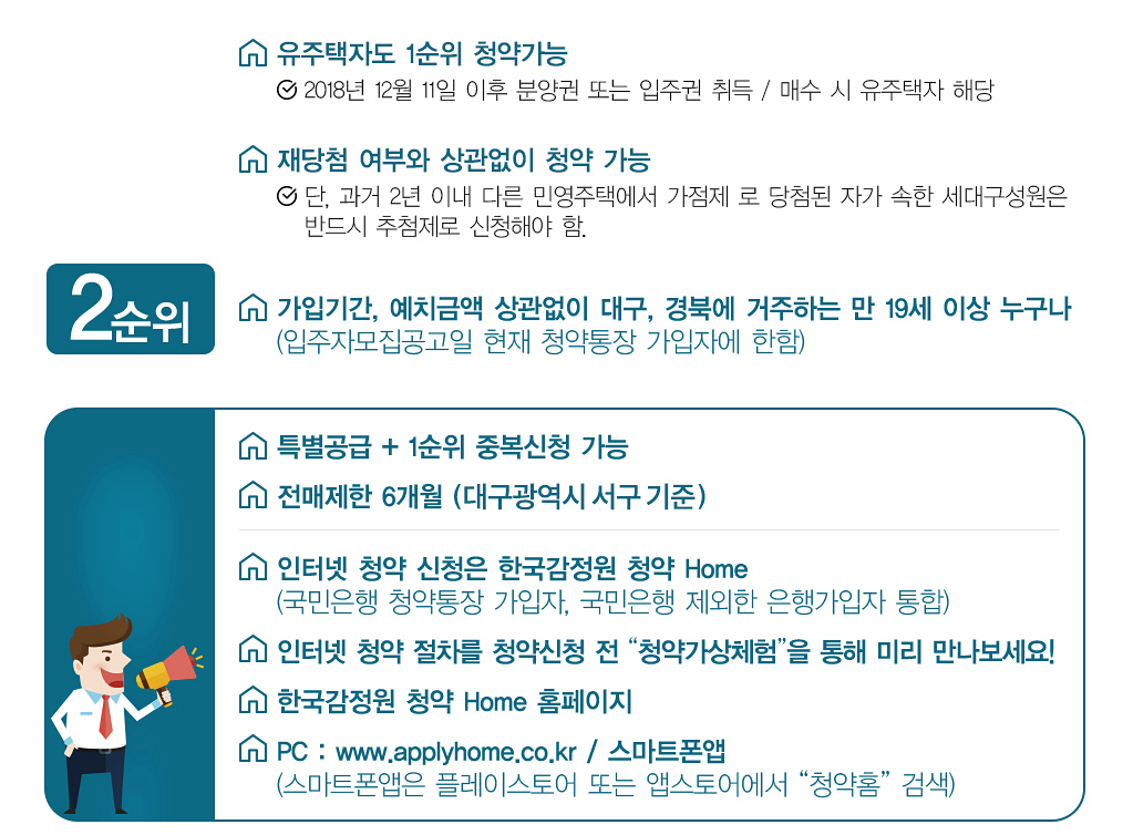 이 단지는 지방 광역시에 적용되는 민간택지 전매 제한 규제 전에 공급되는 막차 단지다. 청약 당첨자는 선정 이후 6개월이 지나면 전매가 가능하다.